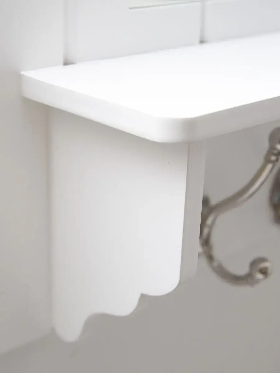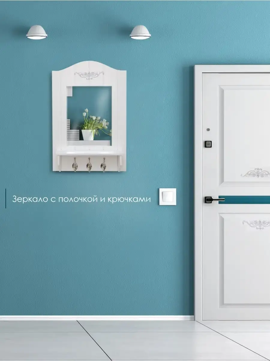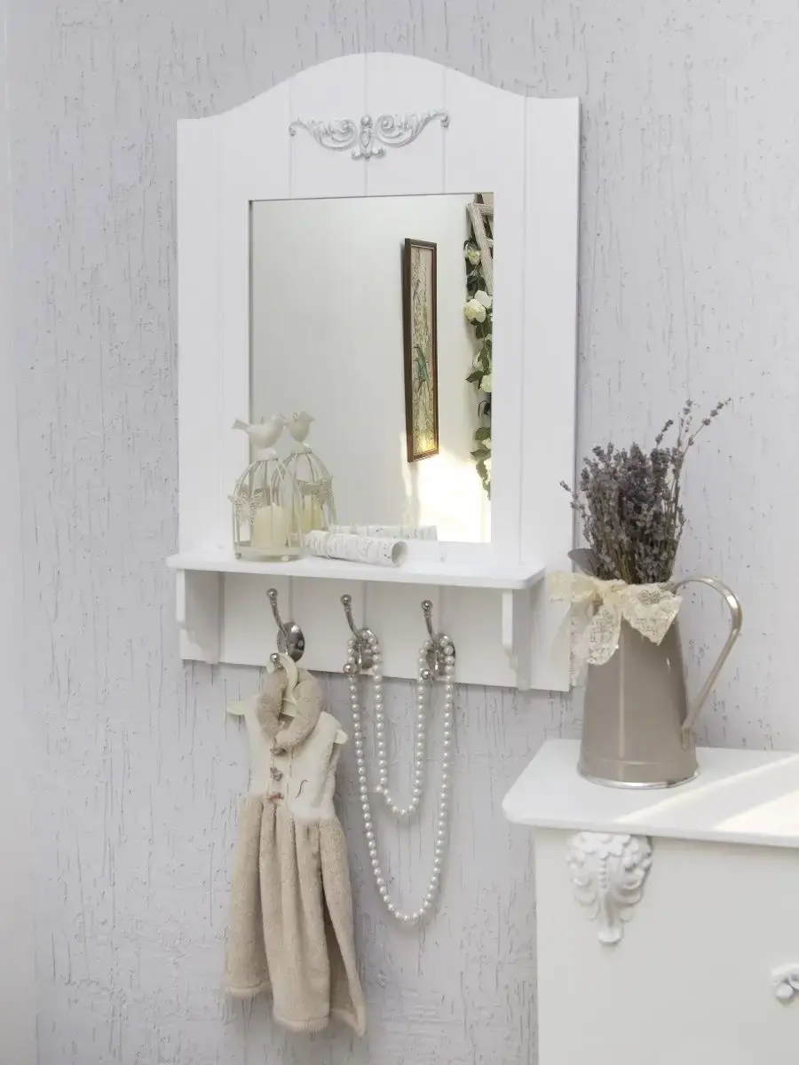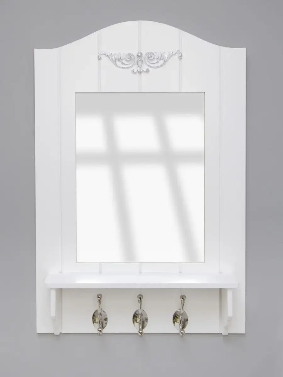 Зеркало настенное с полкой в стиле Прованс. Зеркало в широкой раме дополнено полкой глубиной 10см и тремя крючками. Рама из МДФ 10 мм окрашена акриловой эмалью без запаха. Настенное зеркало подойдет для ванной комнаты или спальни. Белое зеркало 81461924 с серебристой патиной. Зеркало арт 76967965 покрашено с эффектом старения, первый слой коричневый, второй белый с финишным покрытием лаком. Размер зеркала 68х45,5 см, зеркальное полотно 36х28 см. Крепление для стены в комплекте.
