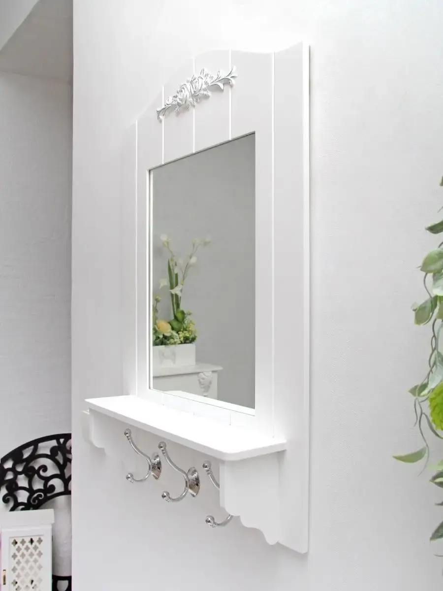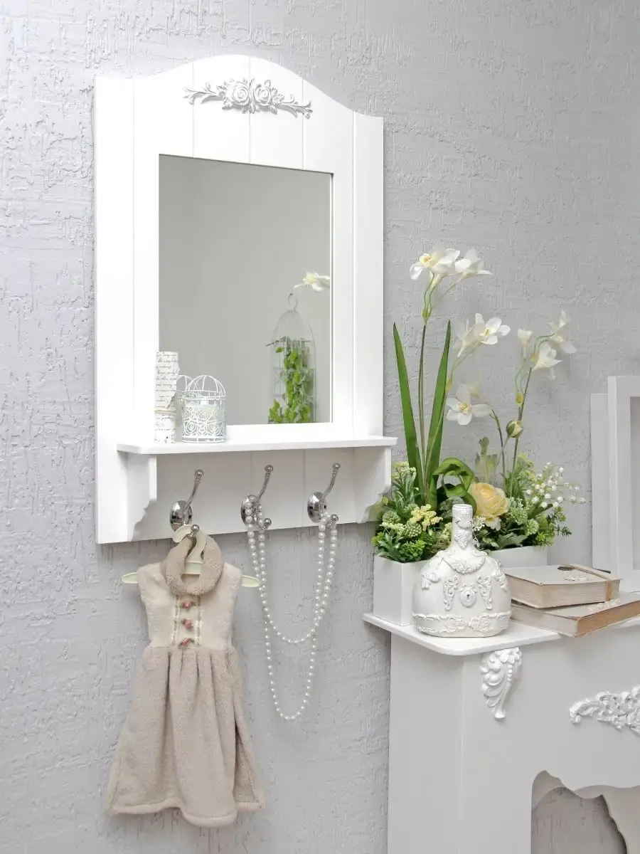 Зеркало настенное с полкой в стиле Прованс. Зеркало в широкой раме дополнено полкой глубиной 10см и тремя крючками. Рама из МДФ 10 мм окрашена акриловой эмалью без запаха. Настенное зеркало подойдет для ванной комнаты или спальни. Белое зеркало 81461924 с серебристой патиной. Зеркало арт 76967965 покрашено с эффектом старения, первый слой коричневый, второй белый с финишным покрытием лаком. Размер зеркала 68х45,5 см, зеркальное полотно 36х28 см. Крепление для стены в комплекте.