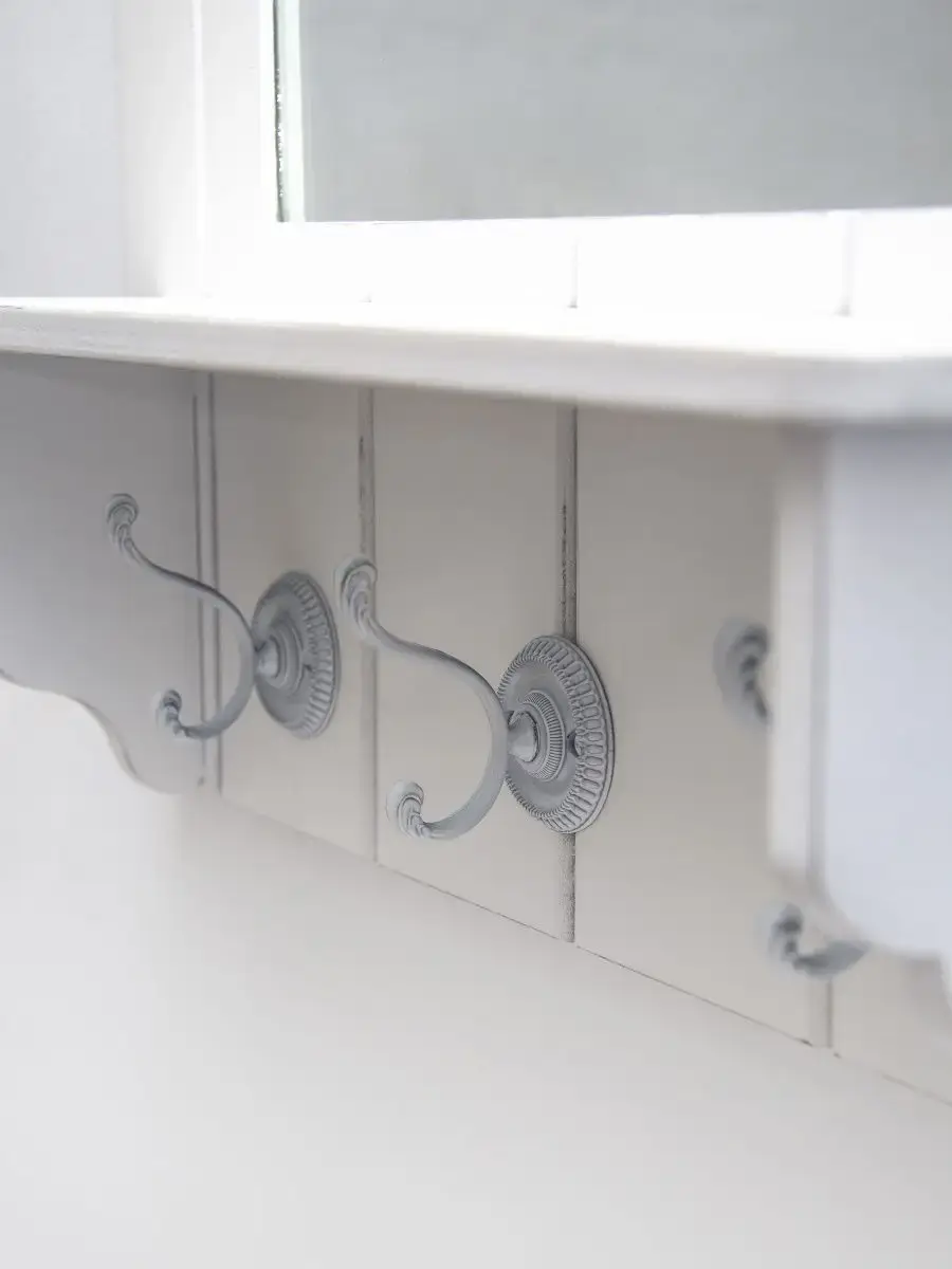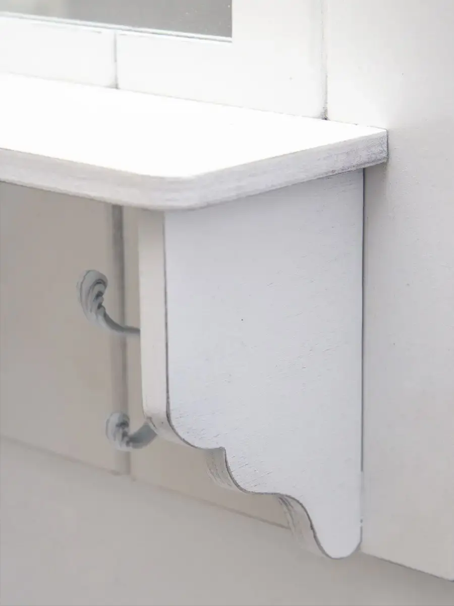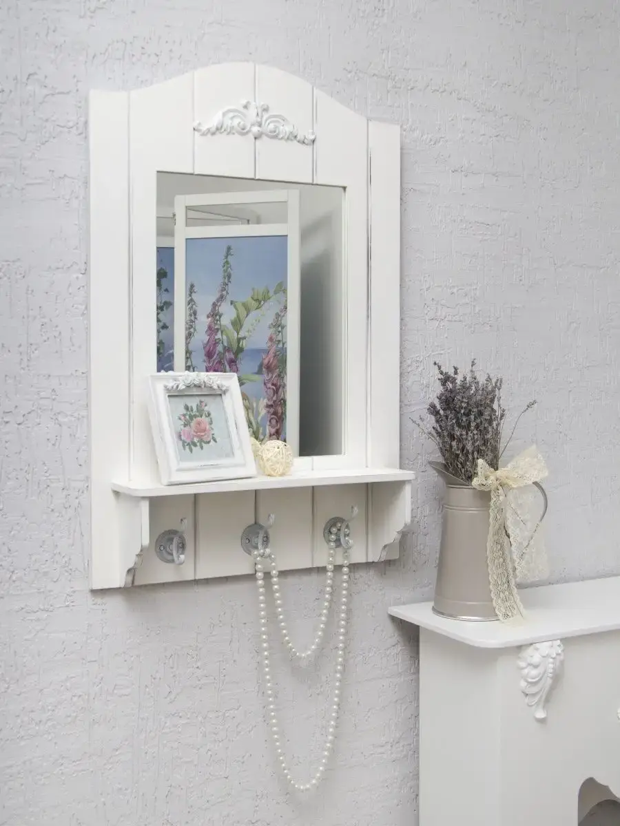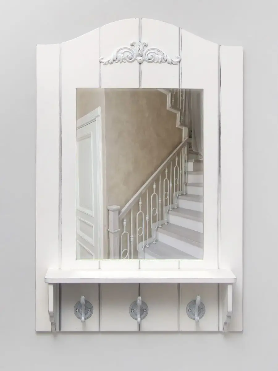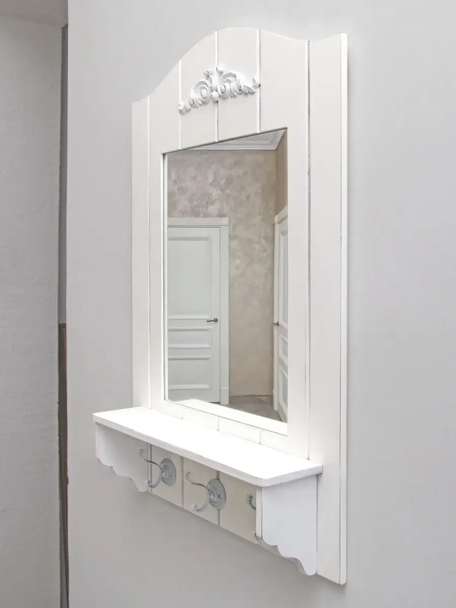 Зеркало настенное с полкой в стиле Прованс. Зеркало в широкой раме дополнено полкой глубиной 10см и тремя крючками. Рама из МДФ 10 мм окрашена акриловой эмалью без запаха. Настенное зеркало подойдет для ванной комнаты или спальни. Белое зеркало 81461924 с серебристой патиной. Зеркало арт 76967965 покрашено с эффектом старения, первый слой коричневый, второй белый с финишным покрытием лаком. Размер зеркала 68х45,5 см, зеркальное полотно 36х28 см. Крепление для стены в комплекте.