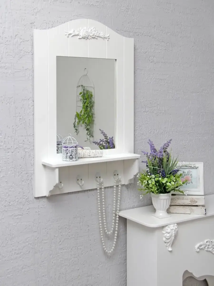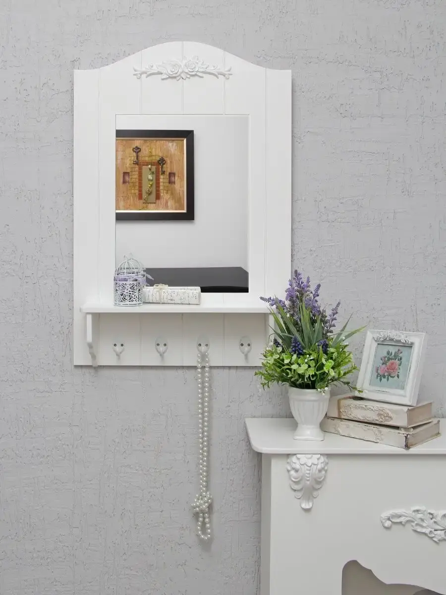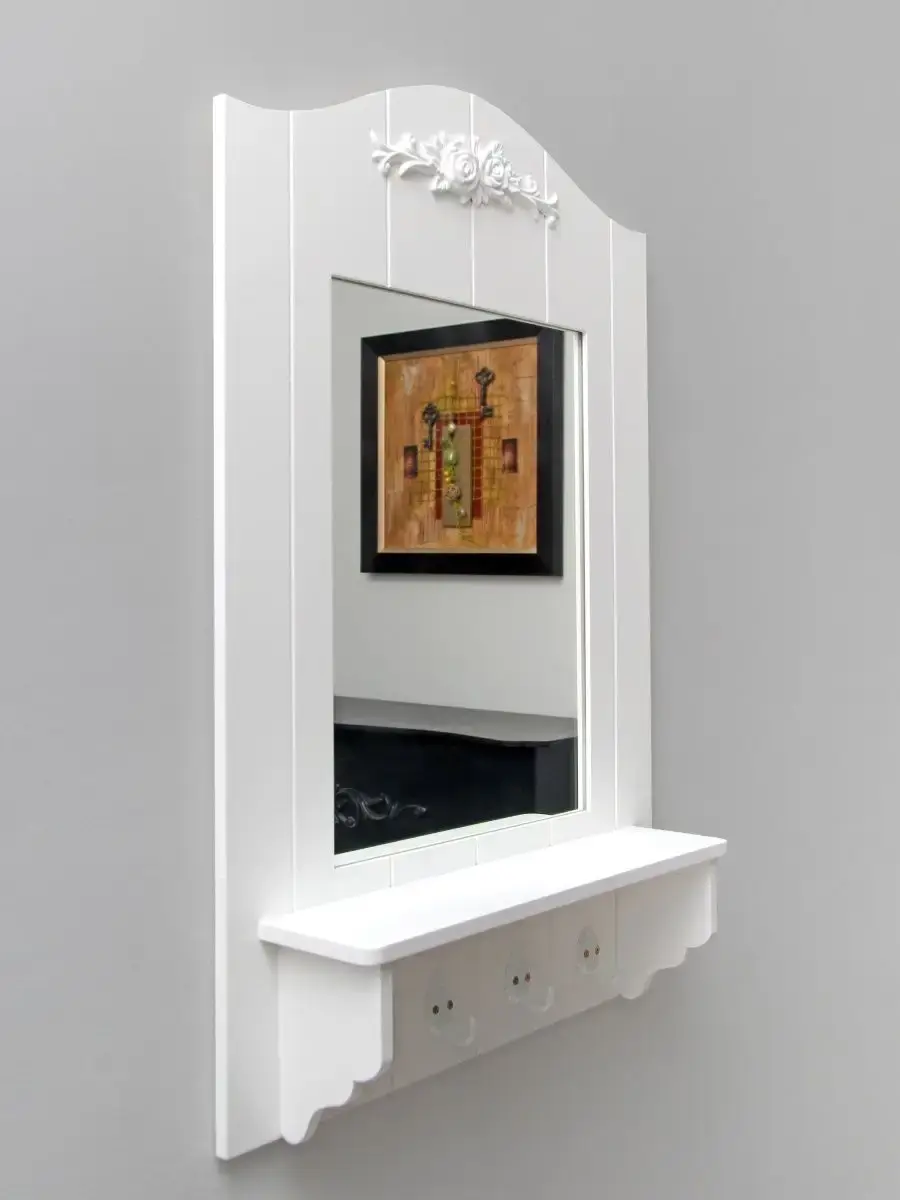 Зеркало настенное с полкой в стиле Прованс. Зеркало в широкой раме дополнено полкой глубиной 10см и тремя крючками. Рама из МДФ 10 мм окрашена акриловой эмалью без запаха. Настенное зеркало подойдет для ванной комнаты или спальни. Белое зеркало 81461924 с серебристой патиной. Зеркало арт 76967965 покрашено с эффектом старения, первый слой коричневый, второй белый с финишным покрытием лаком. Размер зеркала 68х45,5 см, зеркальное полотно 36х28 см. Крепление для стены в комплекте.
