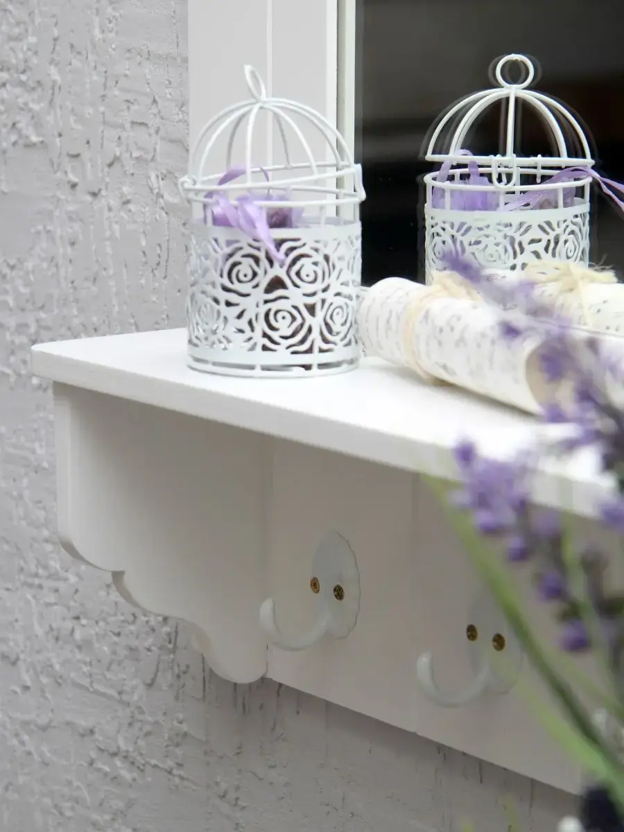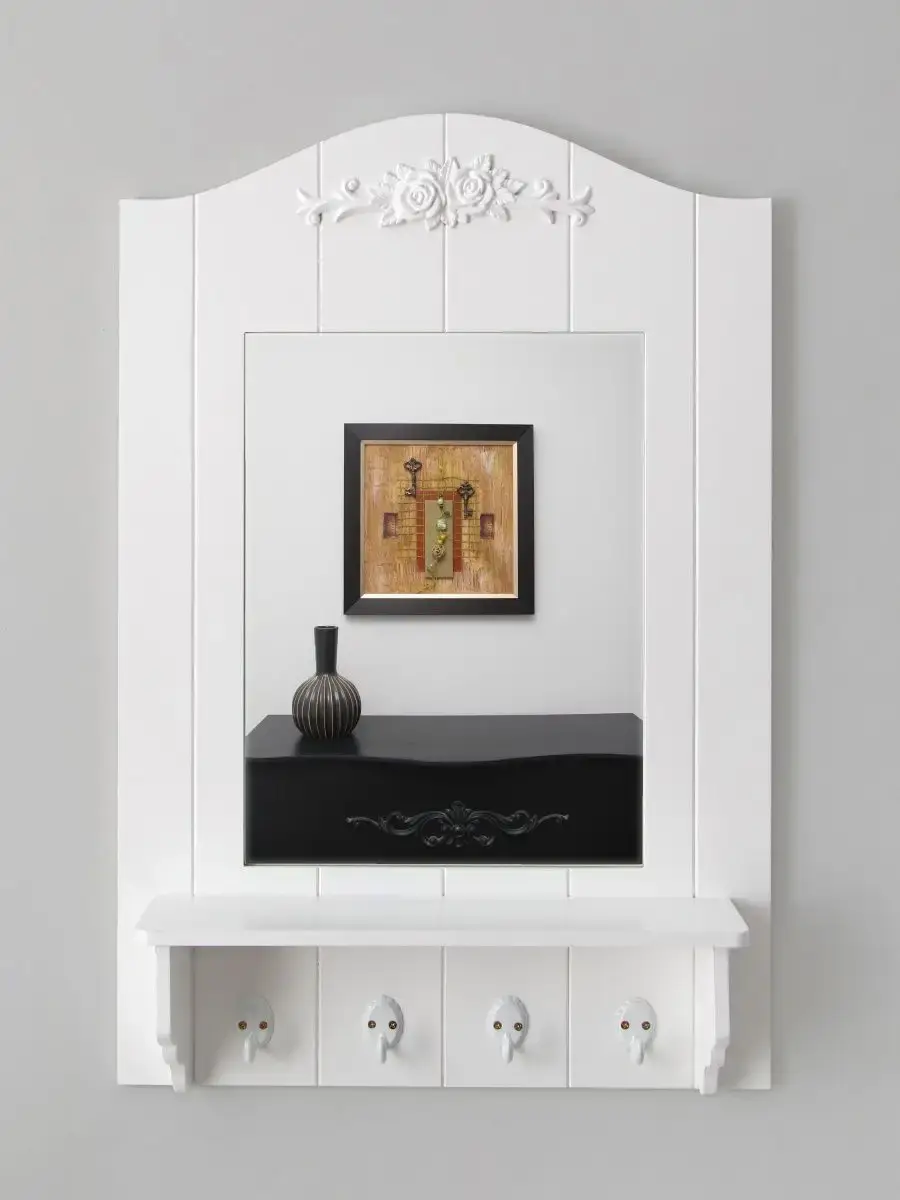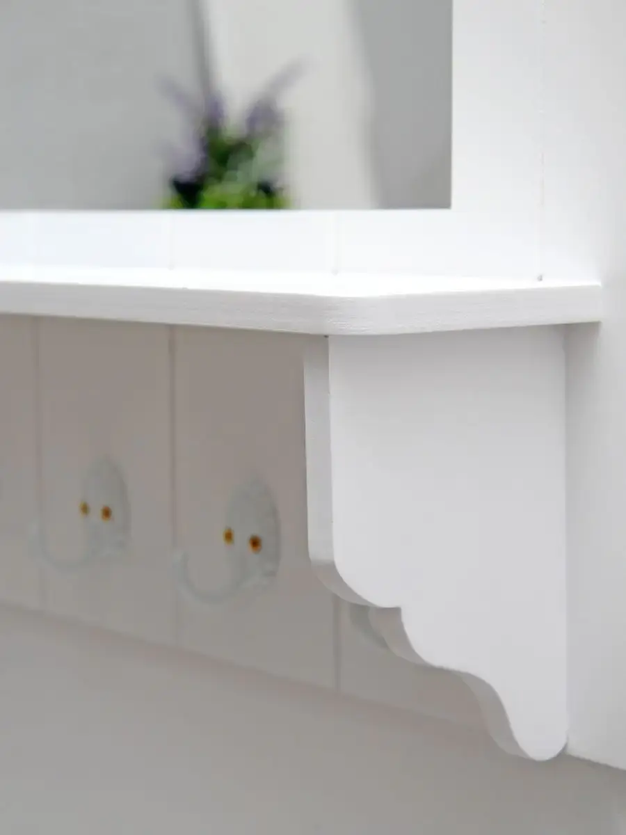 Зеркало настенное с полкой в стиле Прованс. Зеркало в широкой раме дополнено полкой глубиной 10см и тремя крючками. Рама из МДФ 10 мм окрашена акриловой эмалью без запаха. Настенное зеркало подойдет для ванной комнаты или спальни. Белое зеркало 81461924 с серебристой патиной. Зеркало арт 76967965 покрашено с эффектом старения, первый слой коричневый, второй белый с финишным покрытием лаком. Размер зеркала 68х45,5 см, зеркальное полотно 36х28 см. Крепление для стены в комплекте.